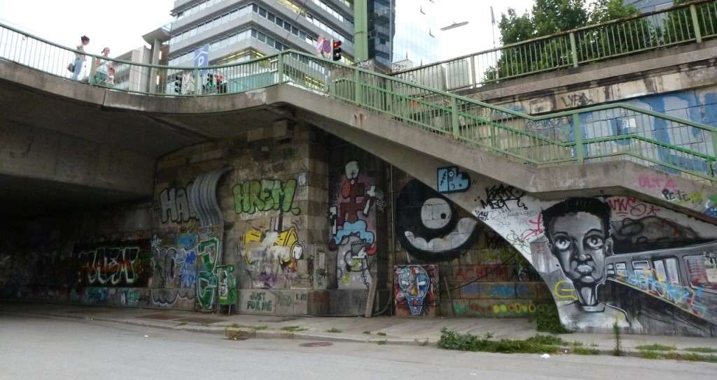Am besten gefiel es uns bisher am Donaukanal. Dort gibt es einige Plätze ohne Platzkarte. Wir suchten uns den Platz bei der Schwedenbrücke aus und haben es dort sehr genossen. Der Platz war direkt am Wasser, eine leichte Brise sorgte immer wieder für Kühlung und die Menschen, die vorbeikamen, waren guter Stimmung. Hier hatten wir Publikum von der Schwedenbrücke herunter, von der Stiege aus, die zur Uferpromenade führt und auf der Uferpromenade selber. Einige haben sich auch auf einer Bank neben uns niedergelassen. Verdient haben wir gleich viel wie am Stephansplatz und besonders berührt hat uns die Gabe einer jungen Frau – zwei liebevoll auf unserem Hutrand arrangierte Blüten.