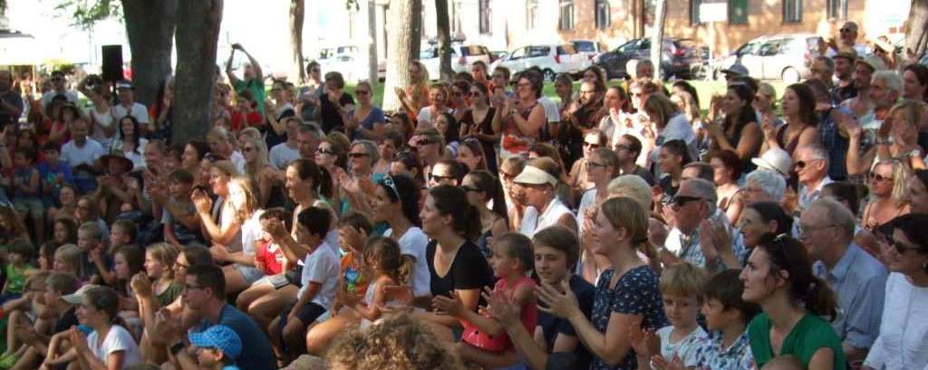 Ebenfalls mitreißend war die erste Vorstellung, bei der wir dabei waren. Ein heißer Sommertag, Schauplatz Burggarten, eine bunte Menschenansammlung vom Säugling bis zu junggeblieben Alten und die Musiker der Compagnie Le Snob. Mit ihren Blas- und Rhythmusinstrumenten und einem Banjo war der Garten, in dem sich manche auch für ein Picknick nieder gelassen hatten, sofort erfüllt von beschwingter Musik. Von Rock und Latin über Funk und Elektro bis zu Klassik und Jazz mit Enthusiasmus dargebracht sorgten die MusikerInnen aus Frankreich für gute Stimmung. Sich selbst im Rhythmus zur Musik zu bewegen, fiel trotz Hitze nicht schwer. Schon eher sich von dieser Musik zu verabschieden, als die Compagnie in ihren orangen Outfits von dannen zog, sich die Menschen zu zerstreuen begannen und nur die Picknickenden zurück blieben. Aber die Musik lag noch in der Luft!