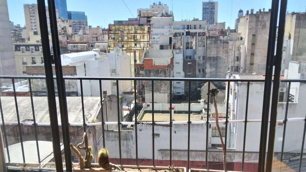 Unsere Wohnung haben wir im Microcenter, also im Herzen der Stadt, die Casa Rosada, der Dom und das Teatro Colon (Opernhaus) sind nur ein paar Blocks entfernt. Und wir sind total glücklich mit dieser Wohnung, nicht nur weil die Lage perfekt ist und wir fast alles zu Fuß erreichen, sondern auch weil sie hell, großzügig und gemütlich ist und sogar groß genug, um hier trainieren zu können. Das Faszinierendste ist aber der Ausblick. Im Wohnzimmer gibt es eine große Glasfront, die wir die meiste Zeit, auch nachts, geöffnet haben. Von da blicken wir auf Hinterhöfe, Häuserfronten und eine Dachlandschaft. Das Ganze ergibt für mich ein urbanes Kunstwerk. Schornsteine, Dachaufbauten, Satellitenschüsseln, unzählige Drähte und Kabeln, die wie ein Spinnennetz zwischen die Häuserfronten gesponnen sind, Fassaden von denen der Putz abbröckelt, Baustellen und mittendrin glänzt ein goldenes Haus. Die Gegensätze dieser Stadt zeigen sich schon beim Blick aus unserer Wohnung.
