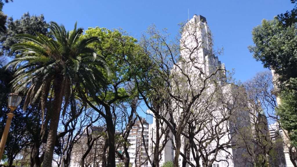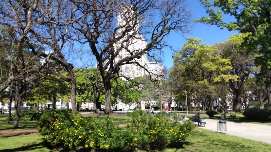 Ein paar Schritte weiter und wir befinden uns auf der Plaza San Martin. Dieser Platz ist eigentlich ein Park, umgeben von vielen sehr alten und schönen Gebäuden. Herausragend ist das Kavanagh-Gebäude, das eine Frau, Corina Kavanagh, im Jahr 1936 erbauen ließ. Es war mit 120 Metern und 33 Stockwerken zeitweise das größte Gebäude Südamerikas und die UNESCO ernannte es zum Welterbe der modernen Architektur. Eine Runde im Park zu drehen, ist sehr wohltuend. Das frische Grün, Vogelgezwitscher, das hier sogar gegen den Lärm dieser Stadt ankommt, und die Frühlingssonne beleben die Sinne.